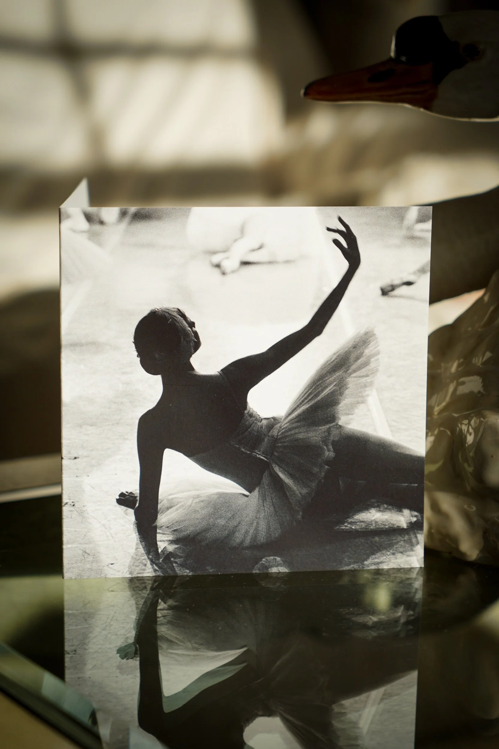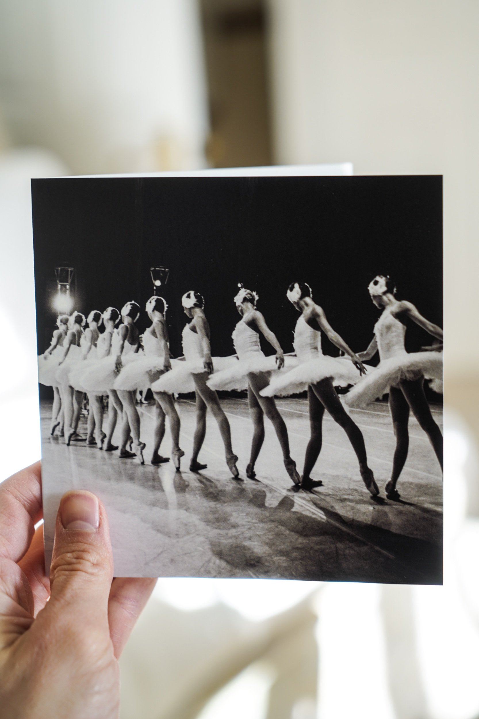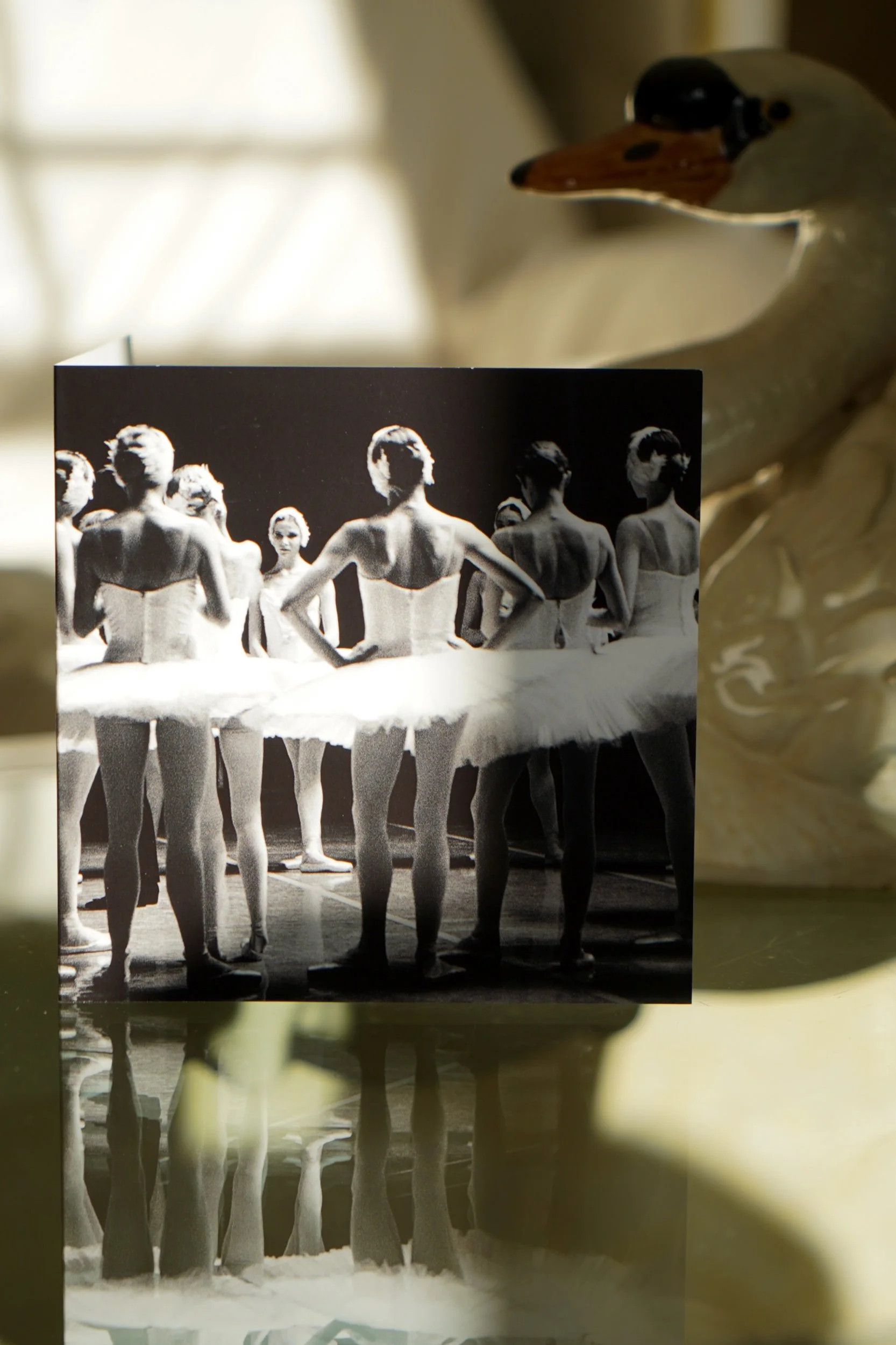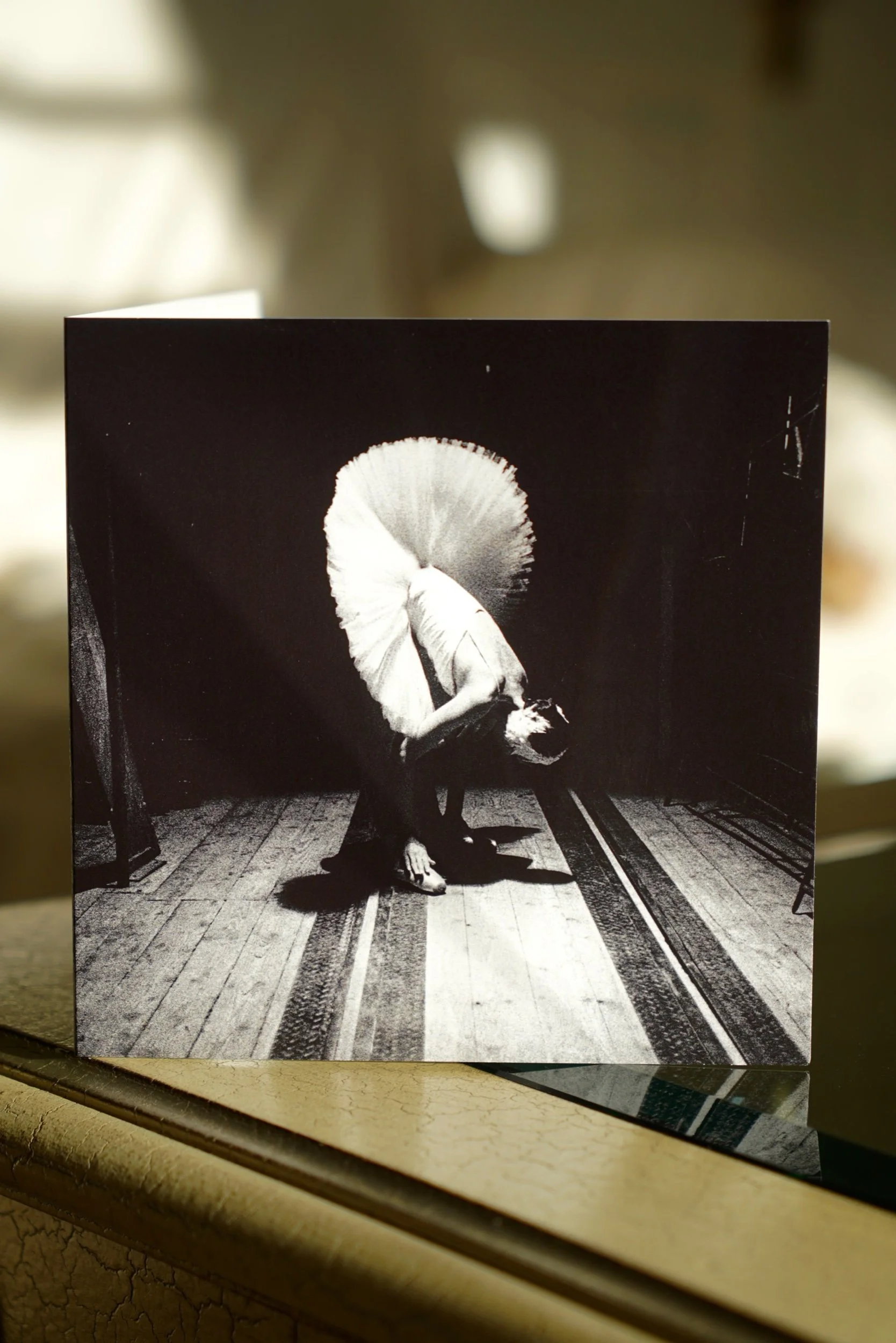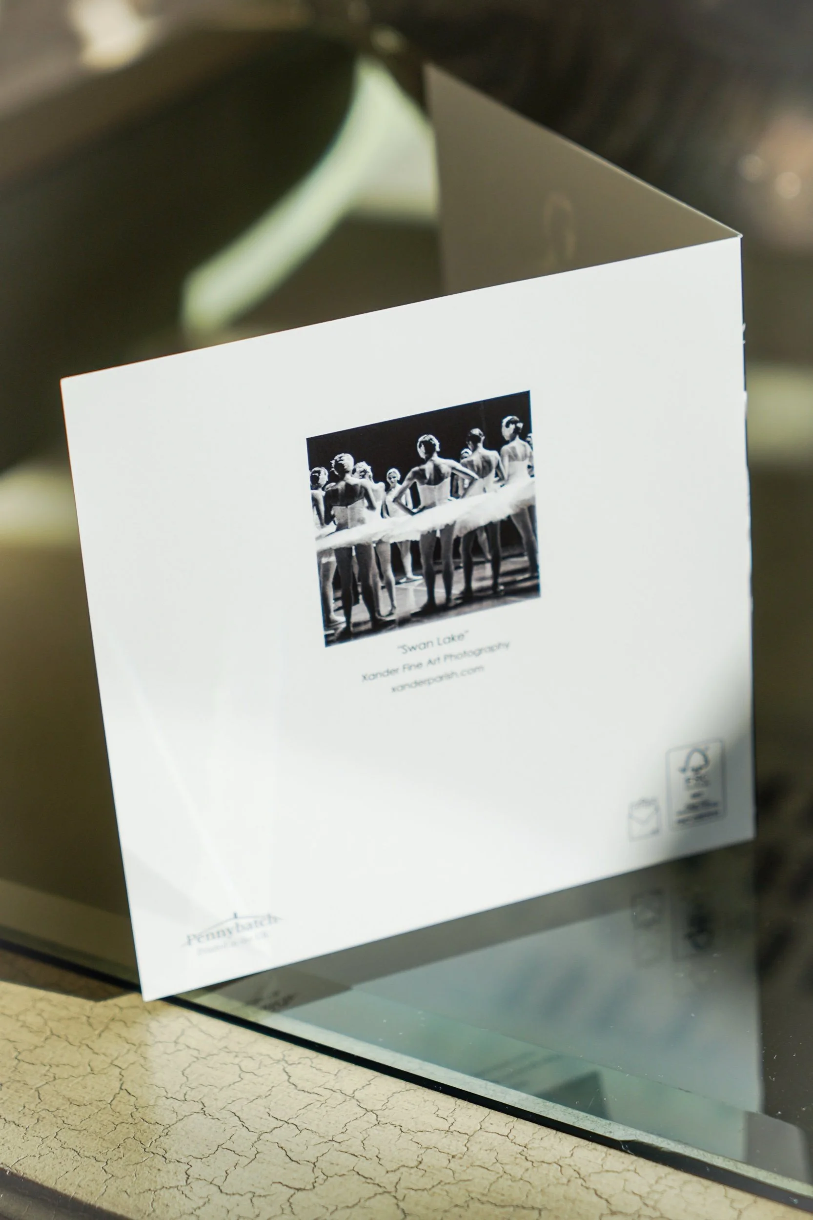 Introducing a pack of five blank greeting cards, each showcasing a unique black and white 35mm photograph by principal dancer and founder of balletclass.com, Xander Parish. This collection features five designs, all printed on premium card stock in the UK using sustainable materials. The set also includes five plain white envelopes. The series is titled "Swan Lake."